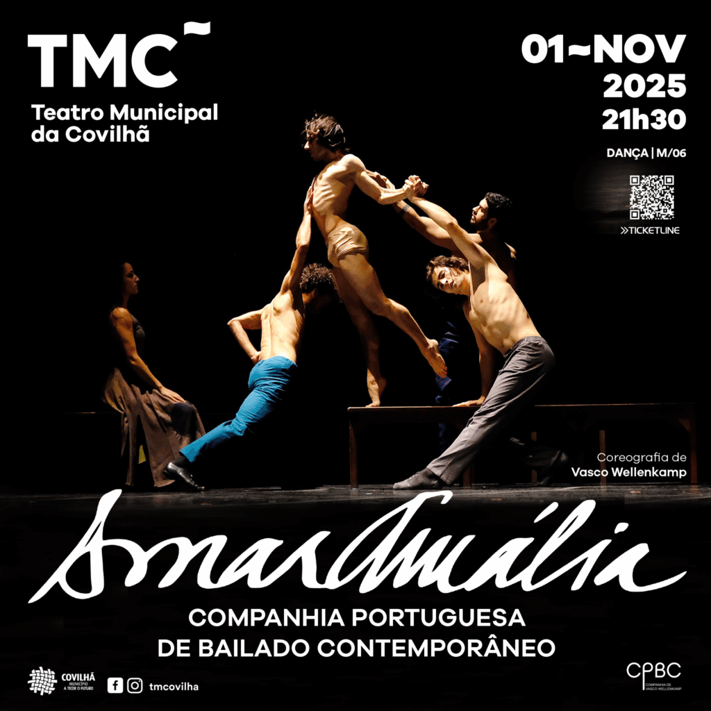 O TMC~ apresenta o espetáculo de dança “AmarAmália”, pela Companhia Portuguesa de Bailado Contemporâneo (CPBC). Com coreografia de Vasco Wellenkamp, a CPBC presta a sua homenagem a Amália Rodrigues, cuja vida, carreira e voz passaram a confundir-se com o próprio país. Nas palavras do coreógrafo, «AmarAmália começará como uma projeção imaginária, uma cerimónia sem tempo e personagens definidas. O seu espaço tanto poderá ser a geometria obscura das vielas e tabernas de Lisboa na sua penumbra habitada, como uma janela debruçada sobre a claridade de um lugar sem nome. As flutuações do destino e das paixões humanas, a tristeza, a separação, a estranheza, o voo e o grito pela liberdade, ressurgirão como a expressão de um sentimento de vida incerta. O discurso teatral acompanhará o espírito de cada um dos poemas escolhidos, ao mesmo tempo que se abandonará à voz de Amália, à sua emoção e às suas múltiplas interpretações, como matéria-prima do seu sentido e da sua própria expressão coreográfica. O que, principalmente, me move ao abordar esta nova obra é prestar uma homenagem sincera a essa extraordinária e inesquecível Artista que tornou o fado universal e orgulho do nosso povo.” Vasco Wellenkamp afirma: “as hipóteses sobre a origem do Fado são muito diversas. Para uns, as suas raízes estão no Oriente, para outros nas canções dos escravos levados para o Brasil que cantavam ao ritmo murmurante do oceano. Gosto da imagem nostálgica de um Fado nascido em alto mar. Mas, enquanto coreógrafo, o que me seduz é sobretudo a emoção e a força dramática com que chegou até nós na voz divina de Amália.” Depois de ter percorrido diversos palcos em Portugal e no estrangeiro, o espetáculo com dez bailarinos e que inclui uma seleção de canções da maior representante do Fado, apresenta-se finalmente na Covilhã. A CPBC, fundada em 1998, por Vasco Wellenkamp e Graça Barroso, foi pensada como uma companhia de repertório, assente numa linha estética contemporânea e diversificada onde coreógrafos, bailarinos, criadores e intérpretes de várias áreas artísticas pudessem pesquisar, desenvolver e amadurecer as suas linguagens construindo uma experiência artística comum. Até ao presente, estreou mais de oitenta obras, apresentando-se em todo o país e também no estrangeiro.