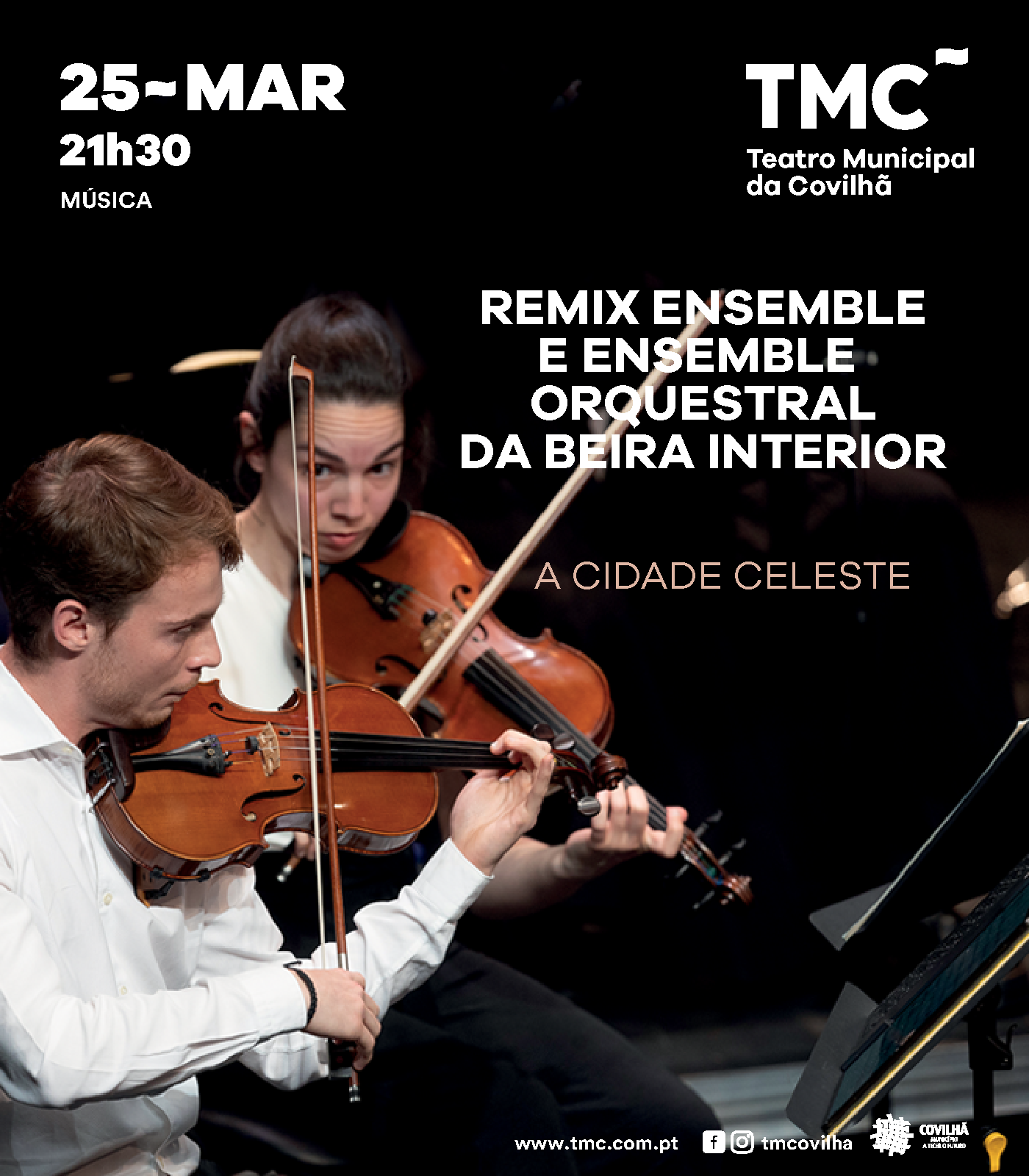 O Ensemble Orquestral da Beira Interior (EOBI) reúne jovens músicos selecionados através de rigorosas audições bienais e promove estreias e encomendas a compositores portugueses. É o que acontece neste concerto no TMC~, em colaboração com o Remix Ensemble Casa da Música, que inclui partituras recentes de Luís Tinoco e Carlos Azevedo, além de uma criação conjunta de três outros compositores destacados do panorama nacional. O programa é enriquecido com uma obra extraordinária de Messiaen, que o próprio compositor comparou a “uma rosácea de catedral de cores resplandecentes e invisíveis”. O concerto conta ainda com direção musical de Pedro Neves e as participações de Filipe Quaresma (violoncelo) e Jonathan Ayerst (piano).